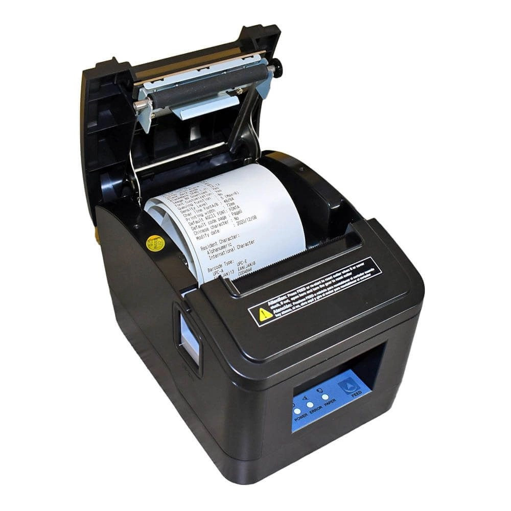 Impresora térmica de alta velocidad de impresión. Bajo consumo de energía, energía eficiente y amigable con el medio ambiente. Soporte de pared. Soporte tamaño de papel 58mm o 80mm ajustable.