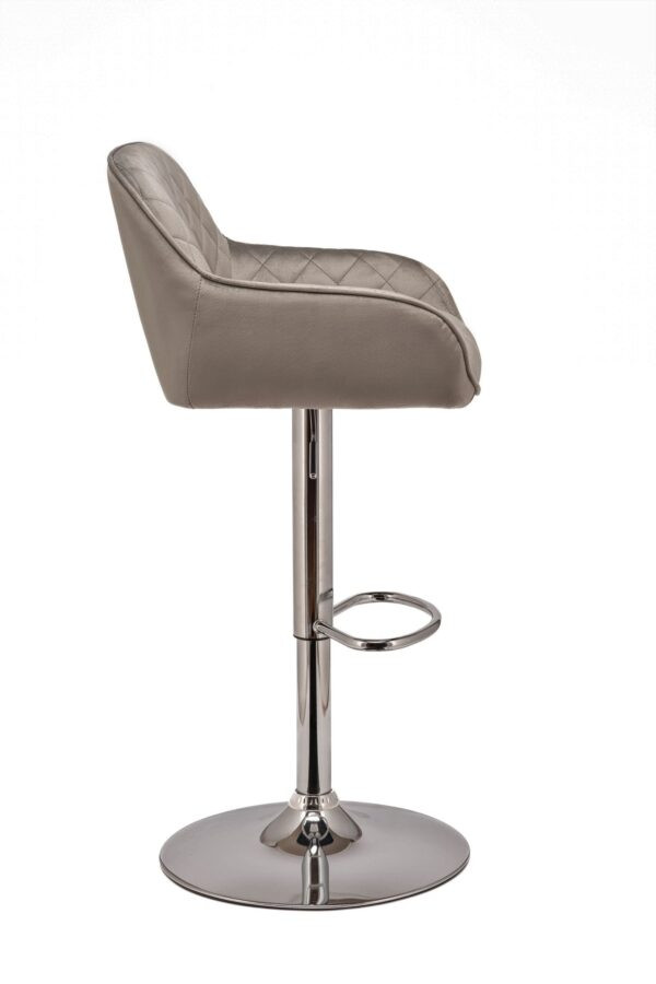 La estructura cromada pulida, que soporta el taburete, cuenta con una palanca de gas para su ajuste y un reposapiés. Una base circular con revestimiento protector aumenta la estabilidad y protege el suelo.