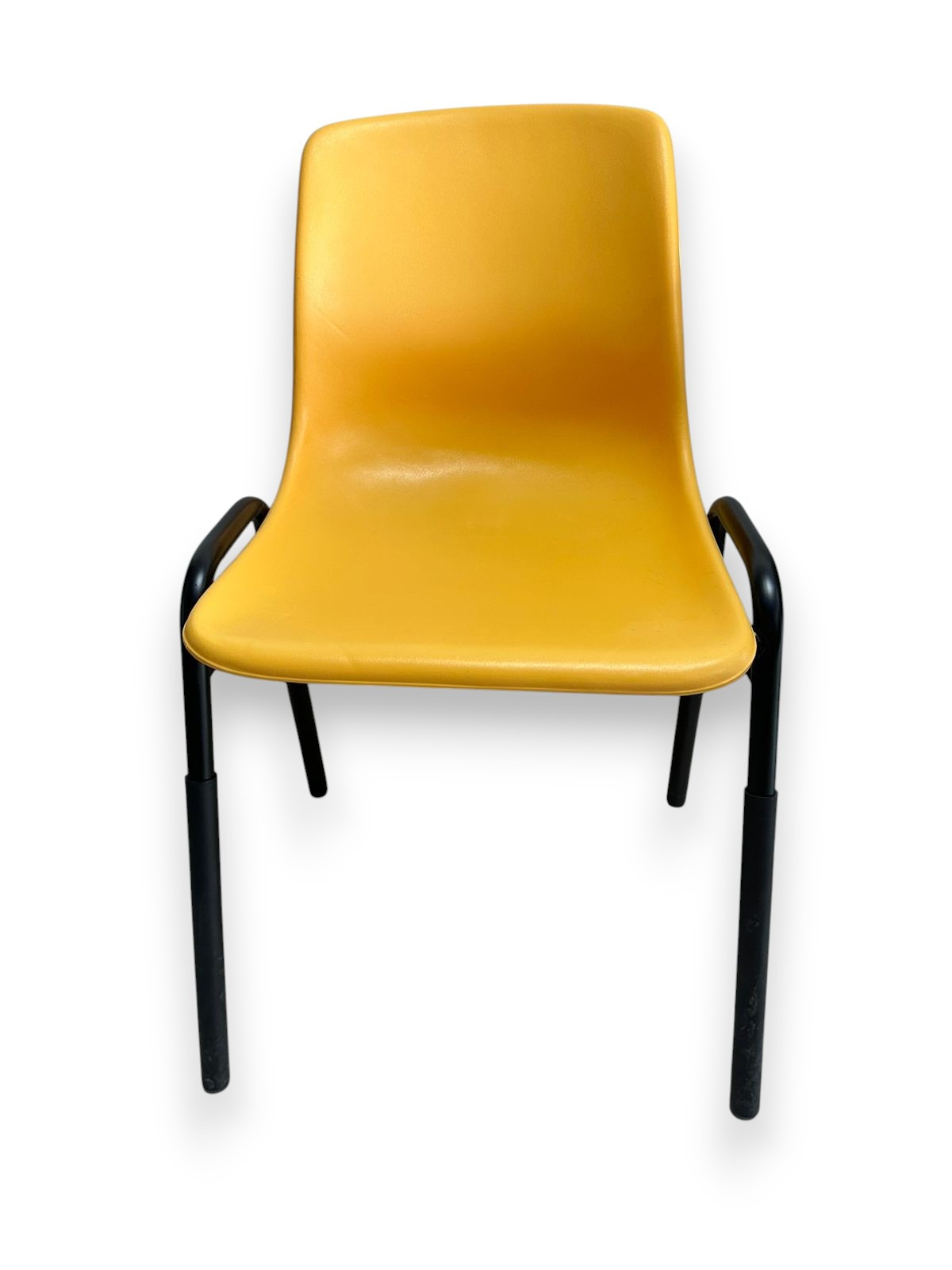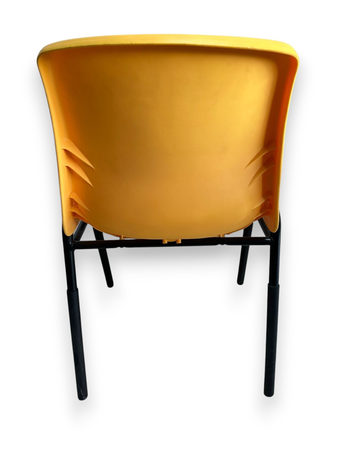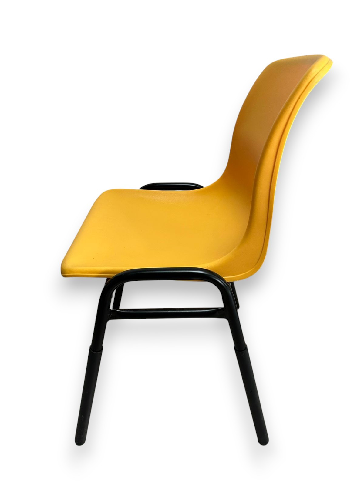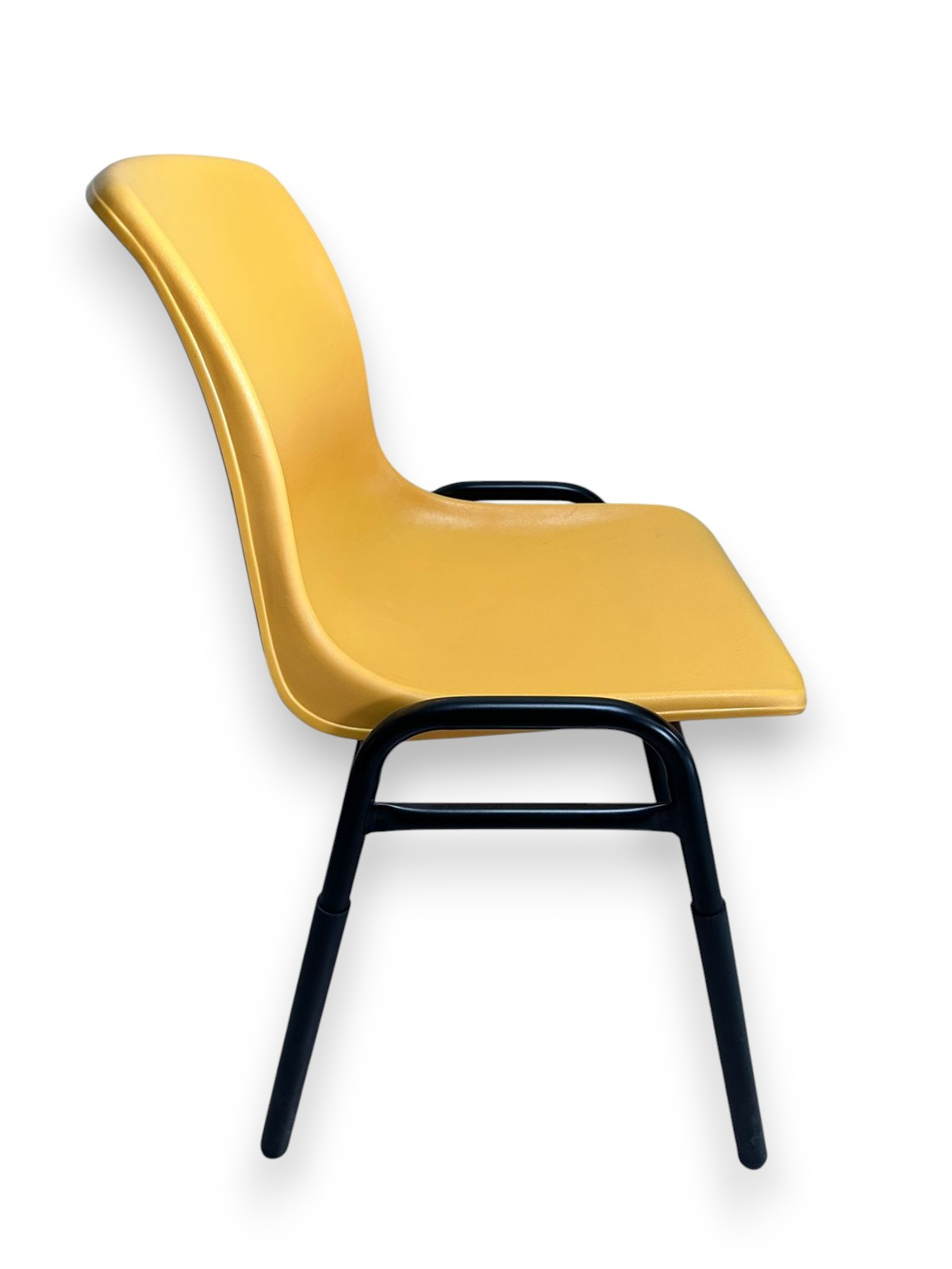 Es una silla moderna y robusta, fabricada con un asiento de polipropileno (PP) moldeado en una sola pieza de color amarillo brillante y patas de metal negro, lo que le confiere durabilidad y resistencia.