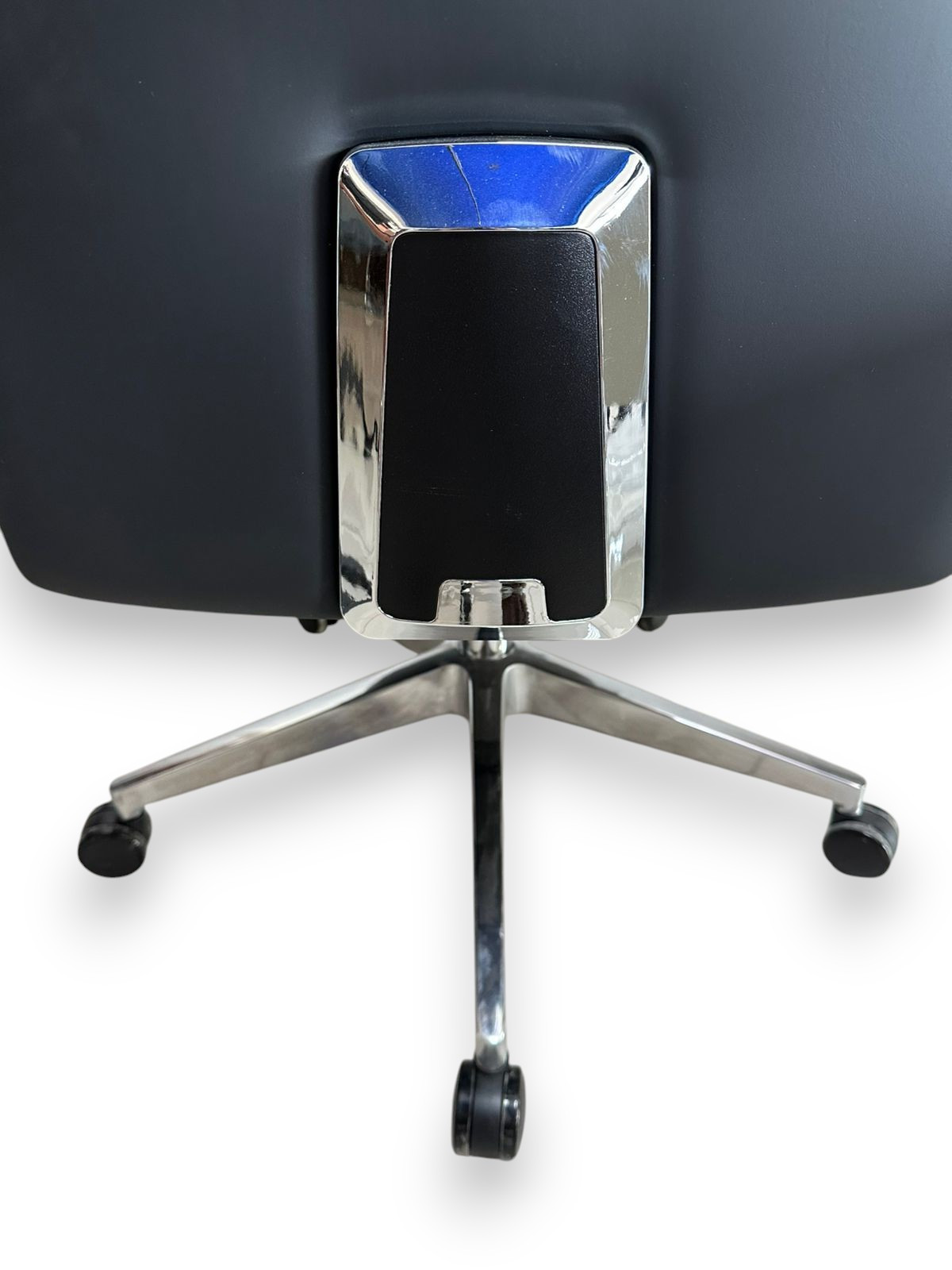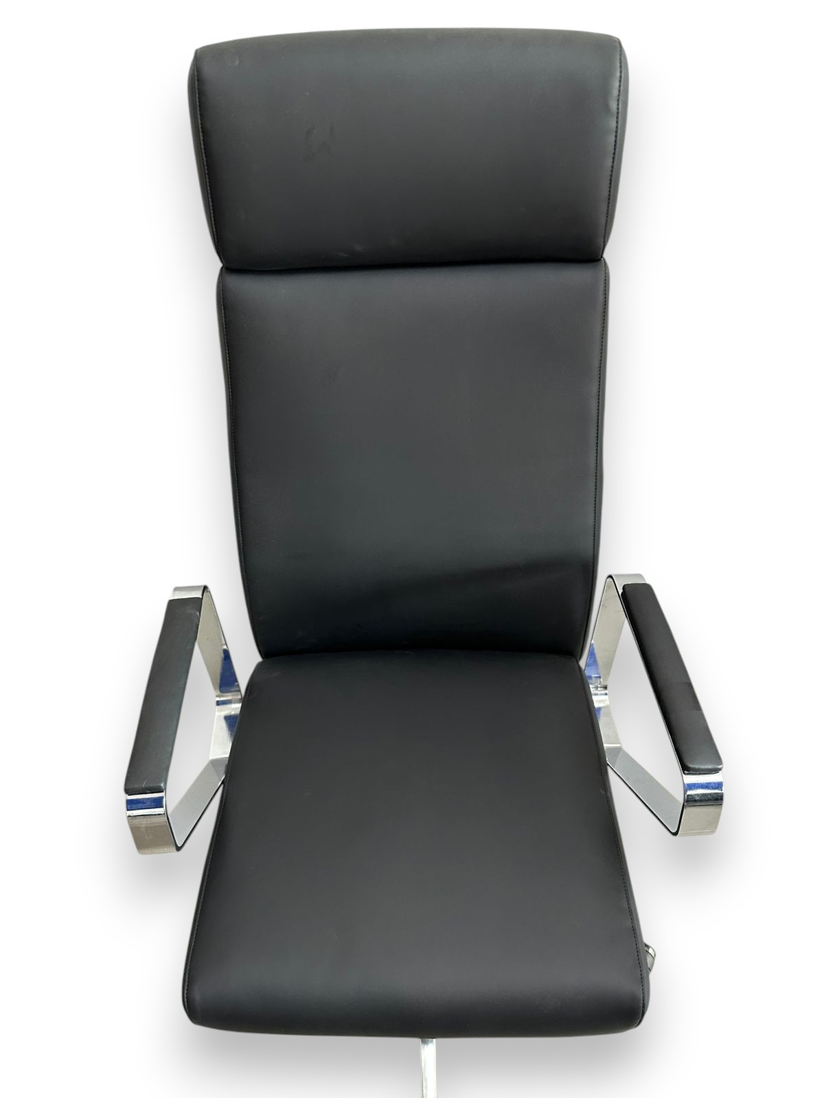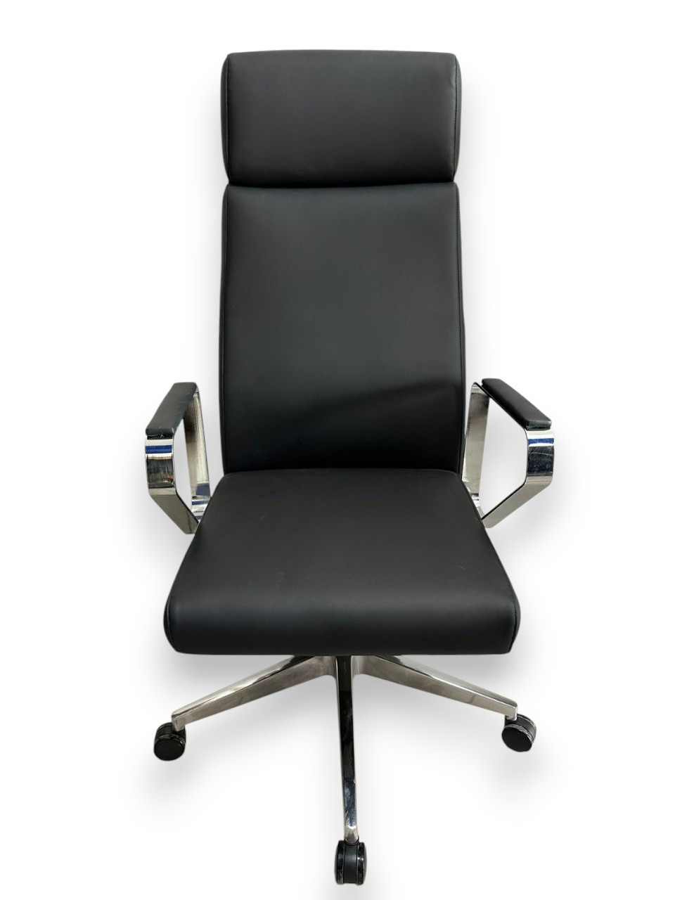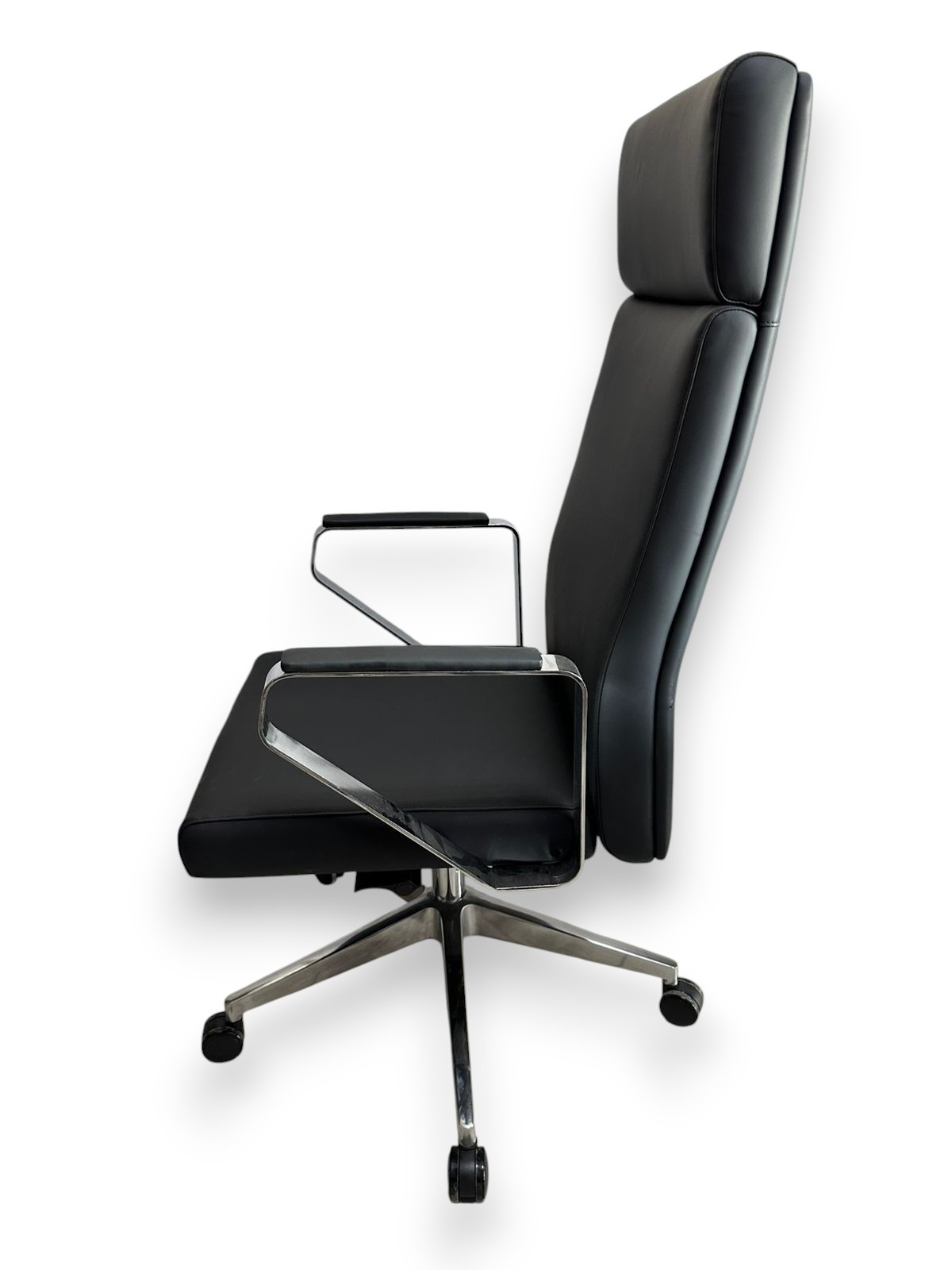 Diseño: silla de respaldo alto con reposacabezas integrado y reposabrazos de acero cromado.