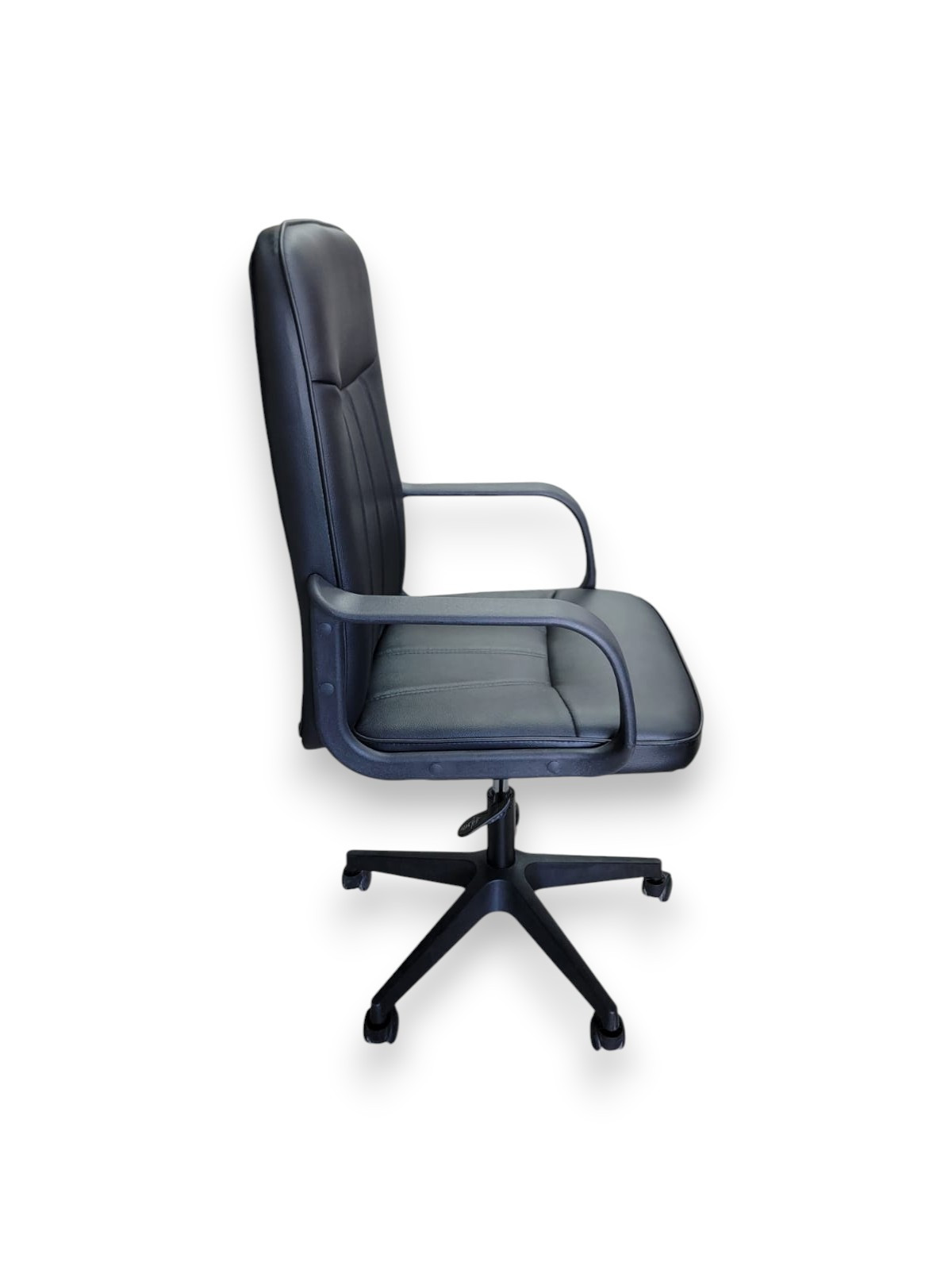 Respaldo alto, Descansabrazos fijos de plástico, Base giratoria (estrella de 5 puntas), altura ajustable. Color negro cuero sintético.